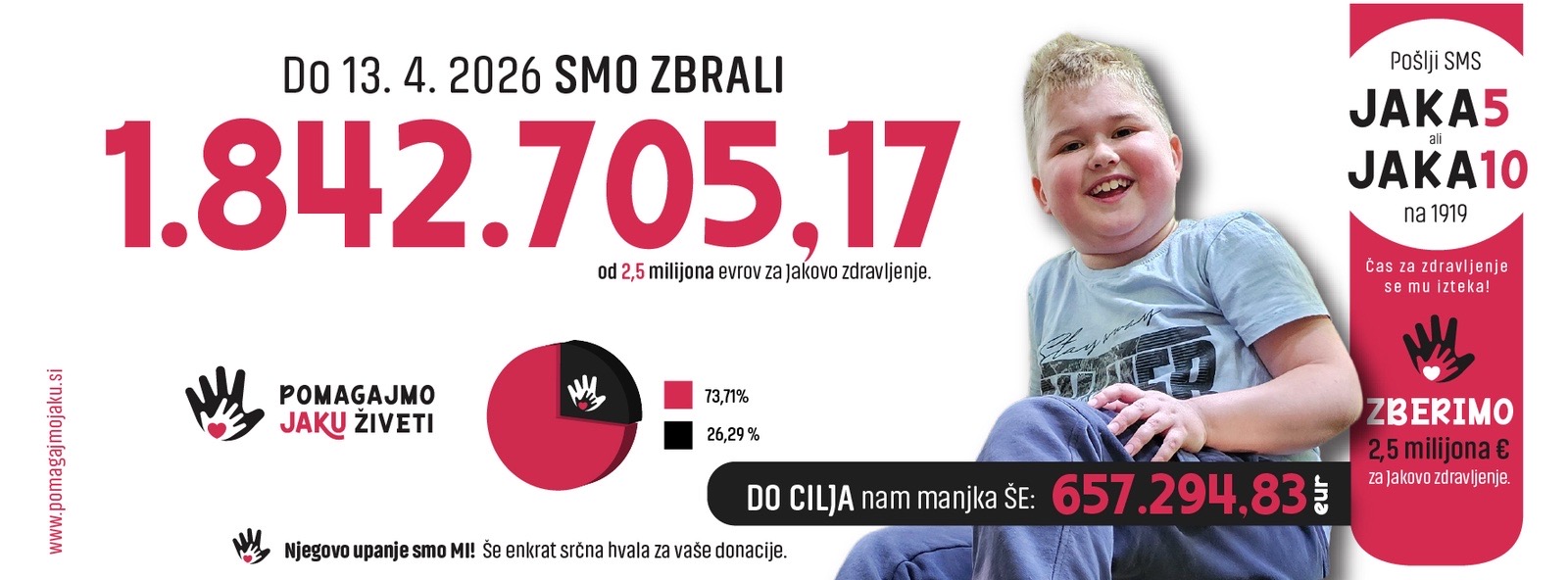 Vsak prispevek – majhen ali velik, prek donacije ali SMS sporočila – pomeni korak bližje zdravilu in prihodnosti za Jaka.